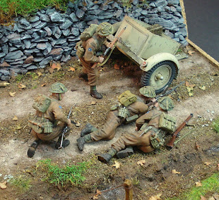 como o material para fazer vegetação em dioramas sempre foi uma dificuldade para se adquirir por aqui, voltamos a improvisar. Desta vez usando uma base pequena para fazer um cenário e fotografar objetos usando-o como fundo, exemplo: figuras, animais e veículos leves. Sobre uma base de EPS foram usadas pedras de aquário para o muro, musgo para a grama mais alta, melindre para a grama baixa, tinta misturada com areia e cola para fazer o solo, além de um sem-número de pedriscos, folhas coloridas e gravetos diversos. Quase tudo obtido da natureza, exceção feita às folhas da árvore cujo tronco é a raiz de uma planta conhecida como Maria-Mole.